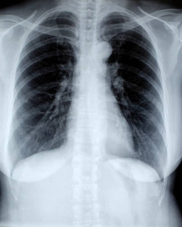 A Chest X‐ray is a safe and painless test that uses a small amount of radiation to take a picture of a person's chest. During the examination, an X‐ray machine sends a beam of radiation through the chest, and an image is recorded on special film or a computer. This image includes organs and structures such as the heart, lungs, large blood vessels, diaphragm, part of the airway, lymph nodes, the upper spine, ribs, collarbone, and breastbone. A chest X‐ray is used to help find the cause of symptoms such as cough, shortness of breath, or chest pain. It can detect signs of asthma, pneumonia, a collapsed lung, heart problems (such as an enlarged heart),and broken ribs or lung damage after an injury.